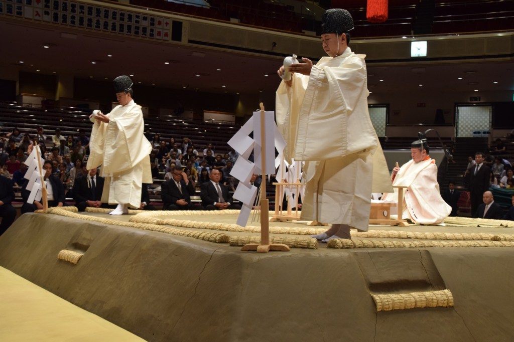 W trakcie rytuału w centralnej części ringu zakopuje się symboliczne ofiary: ryż, sake, suszoną rybę oraz inne dary uważane za święte. Mają one chronić zapaśników przed nieszczęściem i przyciągać przychylność bóstw opiekuńczych. Cała powierzchnia dohyō zostaje następnie posypana solą – tradycyjnym środkiem oczyszczającym w wierzeniach japońskich – co symbolizuje ochronę przed złymi duchami i zapewnienie rytualnej czystości miejsca.